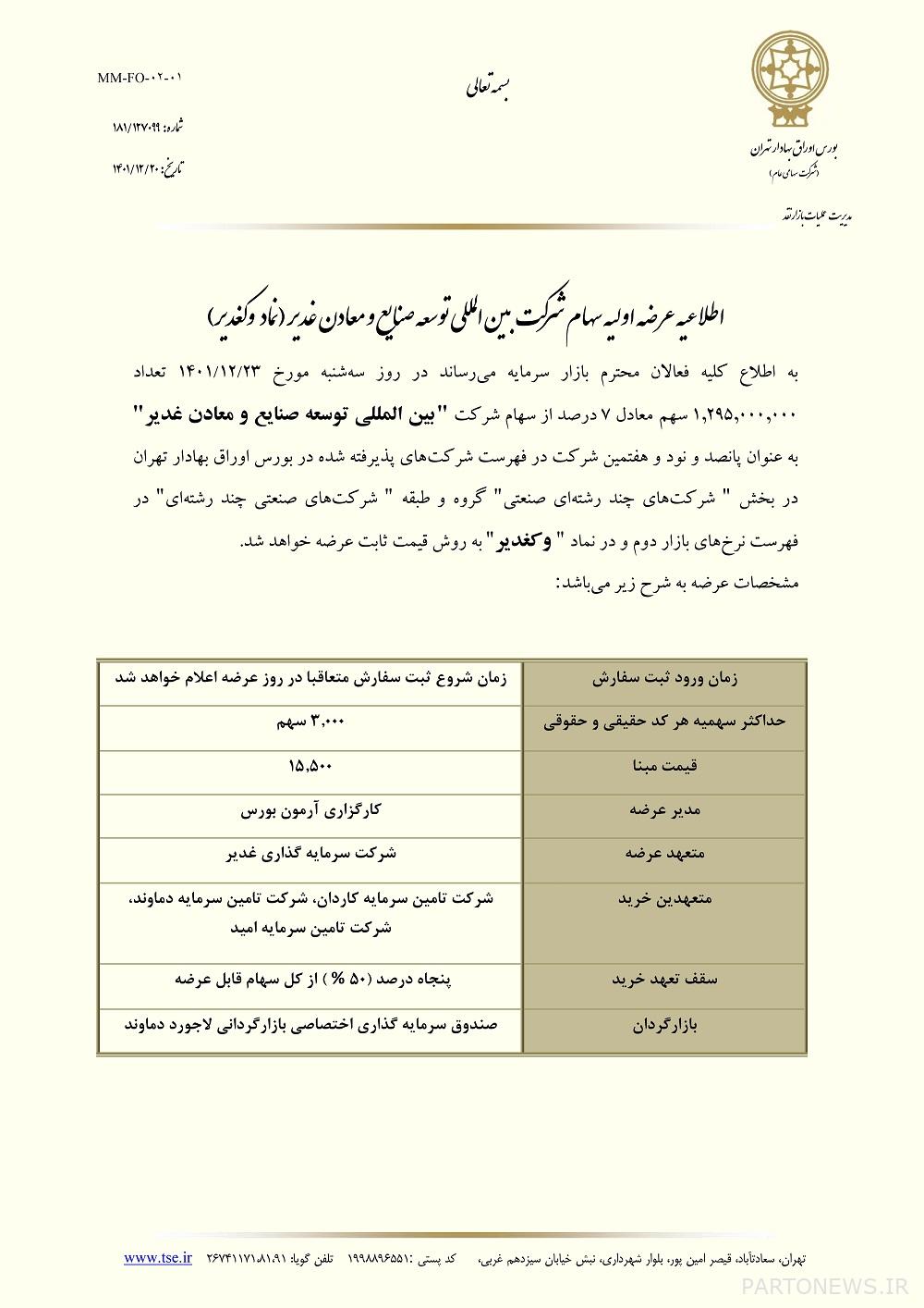 According to this report, on Tuesday, March 23, 1401, one billion and 295 million shares equal to 7% of Ghadir International Industries and Mines Development Company in the sector of multi-discipline industrial companies and in the list of second market rates and with the symbol Vagdir by price method Thabit was initially offered in the capital and securities market of Tehran Stock Exchange.