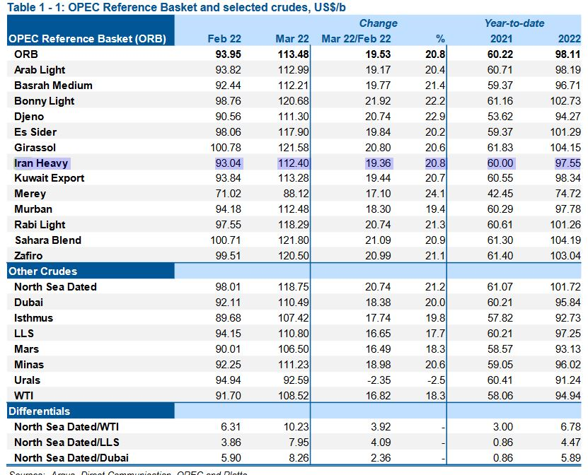 The average price of a barrel of Iranian heavy oil in March 2022 (March 1400) with $ 19 and 36 cents or 20.8 percent increase over the previous month reached $ 112.40.