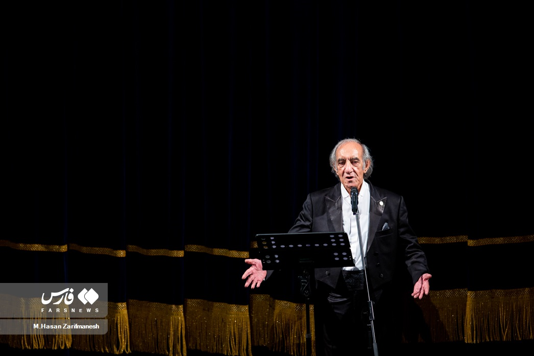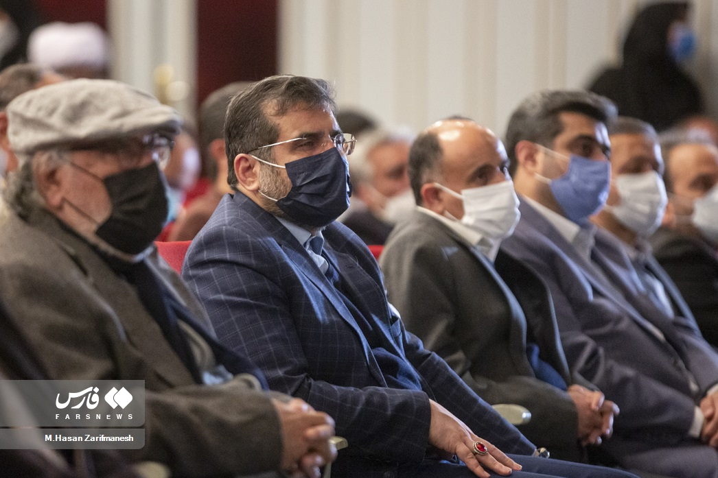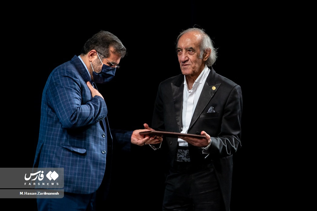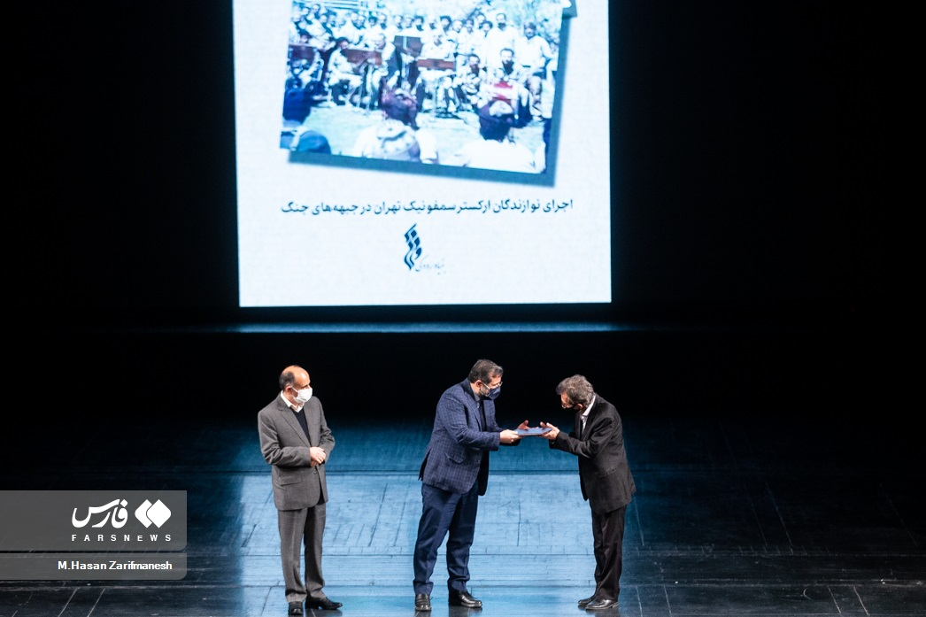 In the final part of the ceremony, veteran artists such as Sadegh Ahangaran, Esfandiar Gharabaghi, Mohammad Ali Golriz, Mohammad Reza Jafari Behnam, Karim Karimi, Mohammad Reza Panahinejad, Babak Mirdadian, Ali Zarabi, Siamak Karimpour, Nasser Rahimi, Reza Sanatinejad, Mohammad Reza Safi, Hassan Zohri, Jahangir Zamani, Ahmad Aziz, Massoud Aali, Shahrokh Shirdost, Behrooz Eslami, Homayoun Rahimian, who were present on the right-against-wrong fronts during the holy defense and inspired the heroes of Iran with their art, plaques of appreciation and gifts It was presented by Mohammad Mehdi Ismaili, Minister of Culture and Islamic Guidance, and Mahmoud Shaloui, Acting Deputy Minister of Arts.