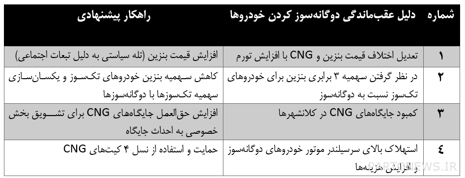 In the previous reports of the “National Fuel” case, some reasons were mentioned for the backwardness of the dual-fuel car burning plan from the program approved by the Economic Council and the lack of public acceptance, which is summarized in Table 3 along with the solution.