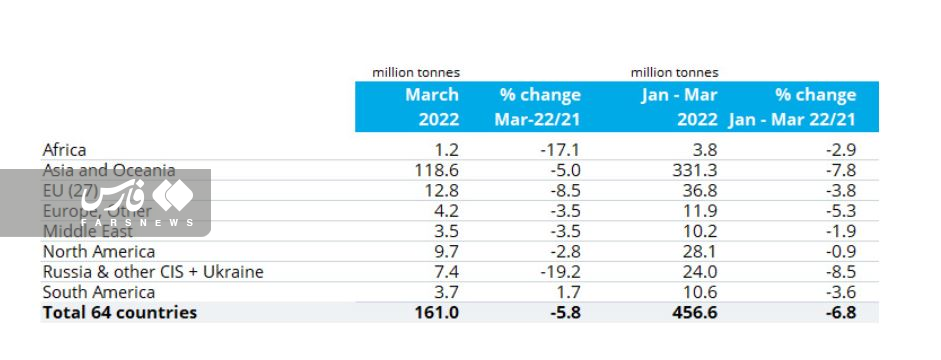 The Commonwealth of Independent States, Russia and Ukraine also fell 19.2 percent to 7.4 million tonnes during the period.