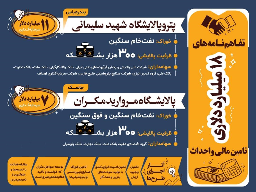 8 of the 11 plans in Table 1 are defined under the law “Supporting the Development of Downstream Oil and Gas Condensate Industries Using Public Investment” and have a permit to breathe food. Recently, the memorandum of understanding for the construction of two Petrorefinery Martyr Soleimani and Marwarid Makran It was finalized and signed on August 10 of this year (picture 2); In this regard, Seyed Ibrahim Raisi, the President of our country, stating that the signing of this memorandum is a step towards the realization of a resistance economy, he says: This memorandum is also an effective step to neutralize sanctions, prevent crude oil sales and convert crude oil into products with higher added value, meet the needs of The country is interested in oil products and creating new export capacities.