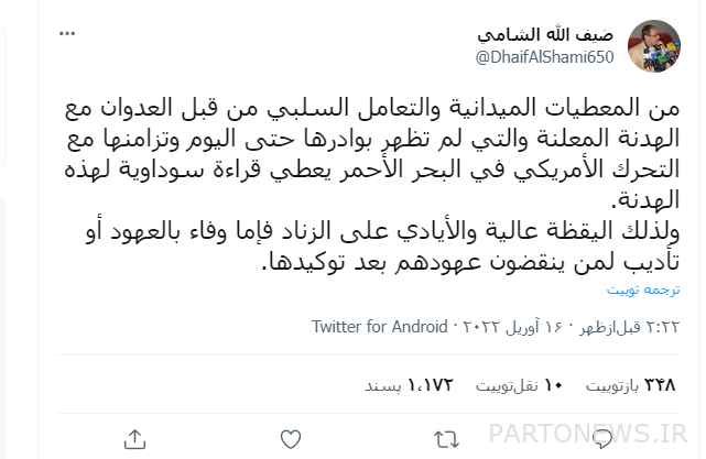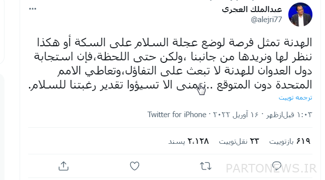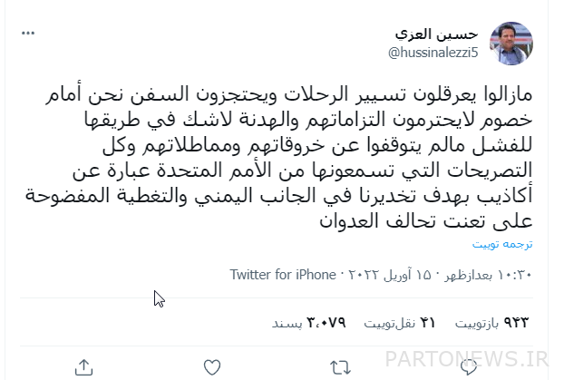 He wrote on his Twitter page that for Sanaa, the ceasefire is an opportunity to put the wheel of peace on the rails, but the response and actions of the aggressor countries do not lead to optimism about the future of the ceasefire.