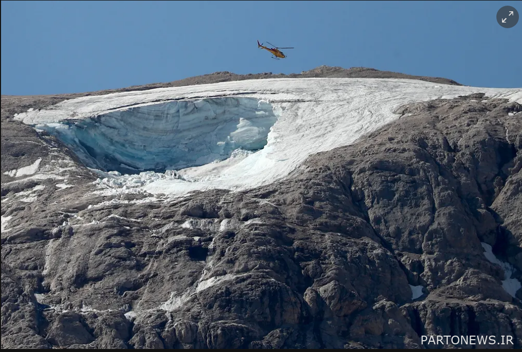 A helicopter flight over the melted part of a glacier on July 4, a day after its collapse led to an avalanche in Kenazi, killing at least ten people.