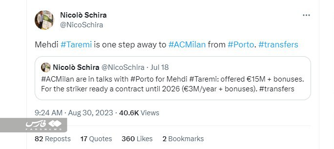 A few moments ago, the famous Italian journalist Nicola Shira announced Taremi’s approach to Milan with a short tweet and wrote: Mehdi Taremi is one step away from Milan.