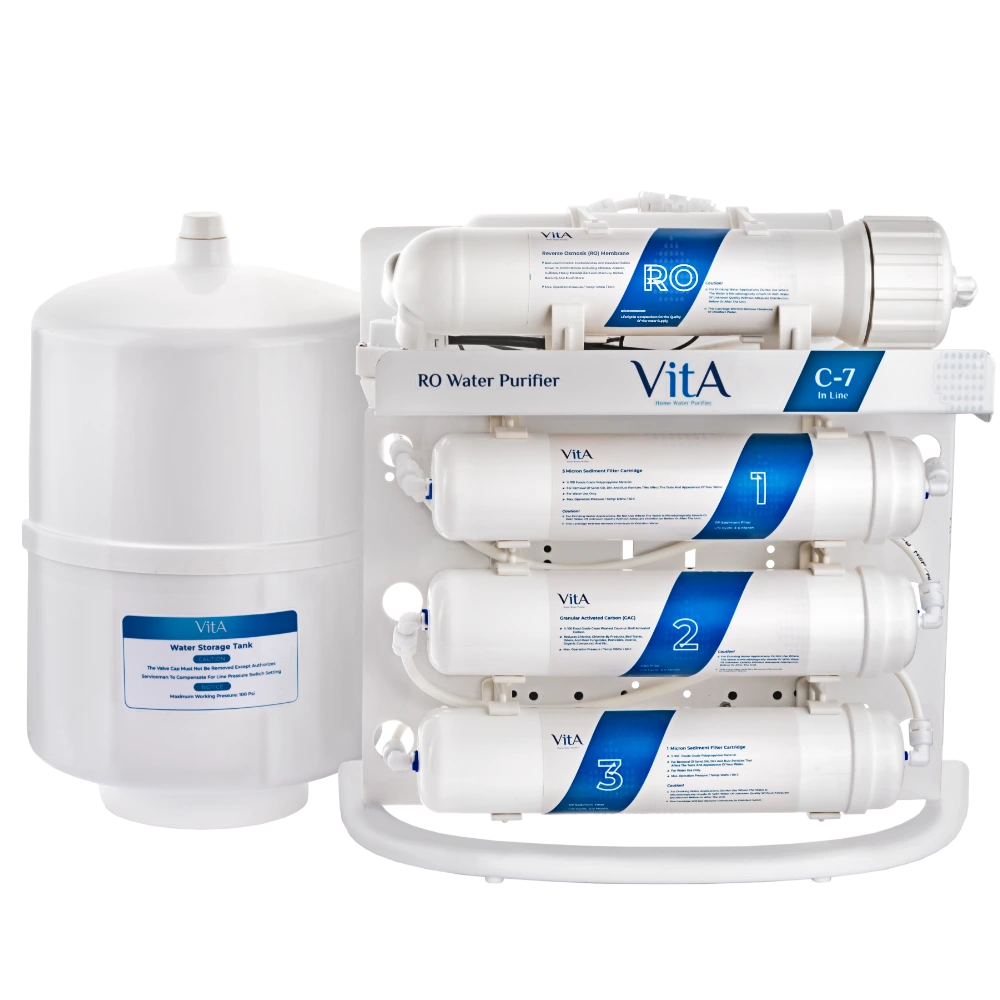Vita water purifier model C-7 with RO technology (reverse osmosis) in five stages with daily production of 200 liters of purified water, is the newest product of Vitawater household water purifier.