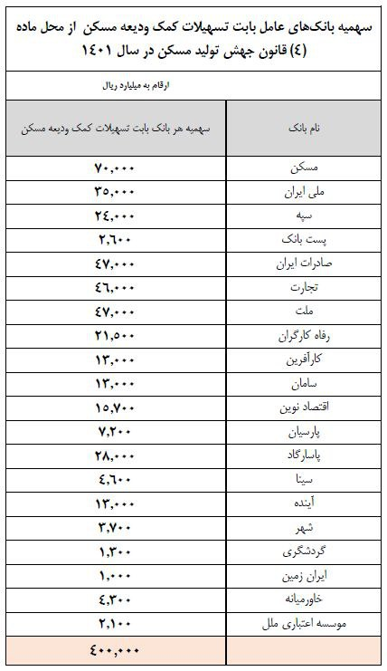 “Housing deposit assistance facilities at the rate approved by the Monetary and Credit Council, maximum repayment period of 5 years, in individual ceilings of 600, 450 and 350 million rials in Tehran, provincial centers and cities with a population of over 200,000 people and other cities, respectively, and from sources “A bank subject to Article (4) of the Housing Production Leap Law (with a total ceiling of 400,000 billion rials in 1401) should be granted.”