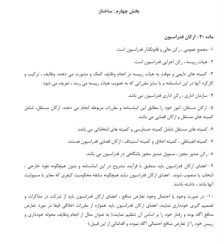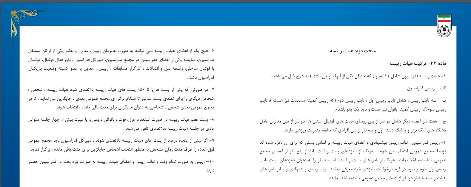 But what are the reasons for their presence and illegal actions? Paragraph 9 of Article 20 of the Articles of Association states: “The members of the members of the Federation shall be elected and appointed in accordance with the process described in this Statute.” Naturally, the Vice President also includes paragraph 9 of Article 20 and is considered a pillar of the Football Federation. Paragraph 2 of Article 33 also mentions that the President of the Football Federation, the proposed Vice President and the members of the Board of Directors are elected by the General Assembly, and with regard to this legal article, there is no other way than to elect individuals to various positions. (Picture below)