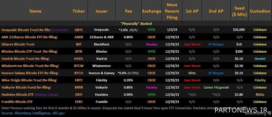 جیمز سیفارت، تحلیلگر بلومبرگ به اشتراک گذاشته شده است در پلت فرم رسانه های اجتماعی X جزئیات ETF بیت کوین نقطه ای که SEC در حال حاضر در حال بررسی است. در اینجا نمایی از دروازه شروع دربی کوانتاکی از امروز صبح است. ما روی این 11 فایل ETF بیت کوین نقطه ای متمرکز شده ایم. انتظار می رود بیشتر این N/A ها در ~ هفته آینده پر شوند. وی افزود که انتظار دارد کمیسیون بورس و اوراق بهادار بین 8 تا 10 ژانویه برخی از درخواست ها را تأیید کند. او نوشت: «هنوز به دنبال سفارشهای تایید احتمالی در آن پنجره 8 تا 10 ژانویه هستیم.